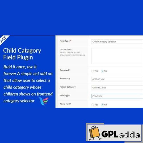 Advanced Custom Fields: Child Category selector Field, is a WordPress Plugin which Adds a Child Category selector Field to Advanced Custom Fields. This field allows you to select the Child category whose children will show as values in the front-end.