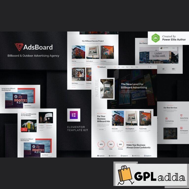 AdsBoard is a modern and clean Elementor Template Kit designed for a Billboard & Outdoor Advertising Agency, Mall Advertising, Billboards Advertising, Media Advertising, and related businesses. It offers a professional design with a 100% responsive layout, retina-ready display, and easy customization without coding.
