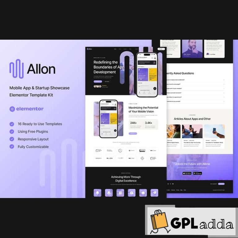 Allon – Mobile App & Startup Showcase Elementor Template Kit (NOT a WordPress Theme) created especially for Mobile App, Application, Download, Startup, Social Media, Agency, or any type of business who wants to publish the services in a professional way. Allone has a simple, modern and clean design with 100% responsive layout, and very easy to customize and can be used by anyone without having to understand coding. This template kit includes stunning carefully crafted 12 Pages and 16 Stunning Templates, you can build your professional-looking website just a click away.