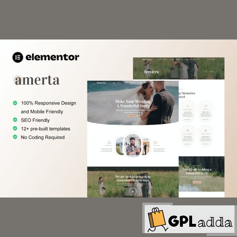 Amerta is Elegant & Beautiful Elementor Template Kit for wedding photography service website. This template has cool, modern, beautiful and professional look. You can easily build modern website that offer professional service for wedding such as photo shooting, video shooting, photography editing, wedding make up, wedding event organizer, photo printing, etc. Just drag and drop, no coding required.