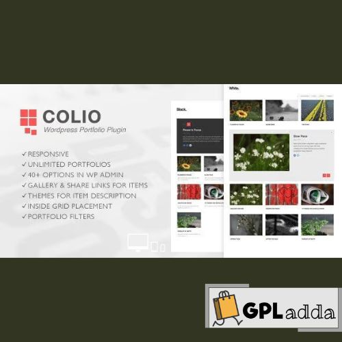 Colio – Responsive WordPress Portfolio Plugin will help you create and manage multiple portfolios for your website with different sets of items and individual settings. In Admin you can easily select number of columns, choose font size for titles, button color and much more. However main feature of the plugin is its ability to display item details on the same page in form of expandable (sliding down) viewport, that can appear before, after or even inside the grid! Besides this plugin comes with two themes for item details, can display extra photos as feed or as slider and provide social links for easy sharing your works.