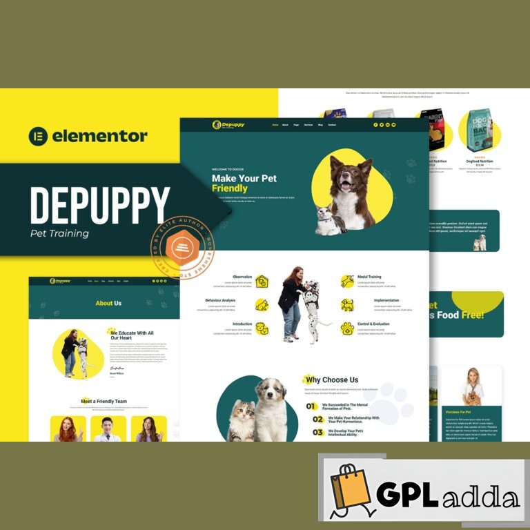 Welcome to Depuppy – Pet Training Elementor Template Kit. Depuppy is a powerful and responsive element template kit for Pet Training, Pet School, Pet Shop, Pet Care & Veterinary. Depuppy is beautifully designed yet modern and elegant in minutes. You can create a creative and responsive site completely according to the needs of your Pet Training. This template is very easy to use. You only need to change the photo and the title you want. Only that!