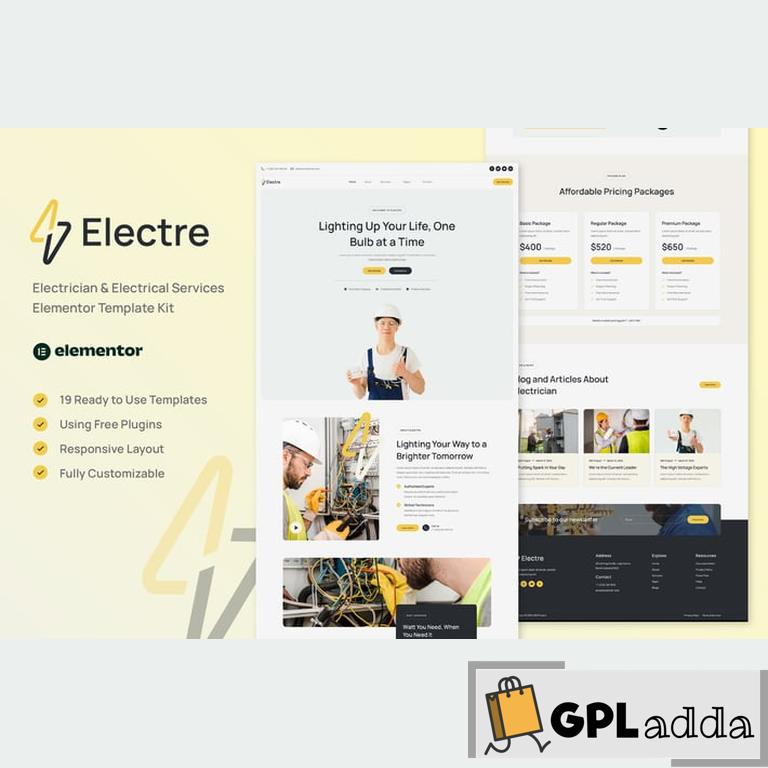 Electre – Electrician & Electrical Services Elementor Template Kit (NOT a WordPress Theme) created especially for electric, electrical repairer, electricity business, electrician company, electricity services, cable repair, lighting shop, or any type of business who wants to publish the services in professional way. Electre has a simple, modern and clean design with 100% responsive layout, and very easy to customize and can be used by anyone without having to understand coding. This template kit includes stunning carefully crafted 14 Pages and 19 Stunning Templates, you can build your professional-looking website just a click away.