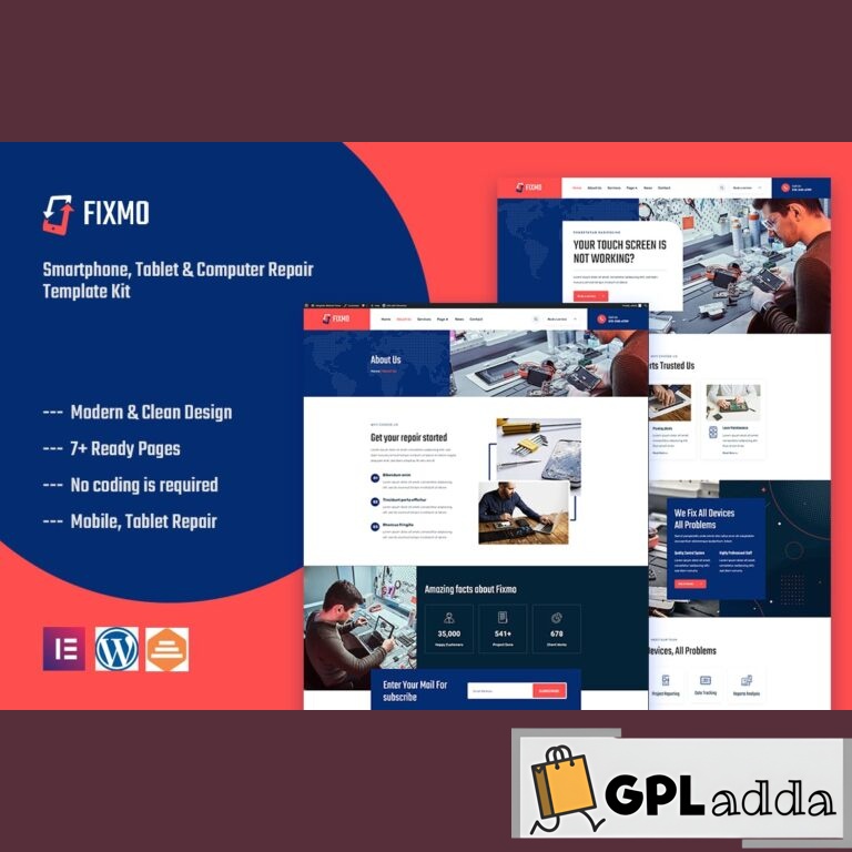 Fixmois an Elementor Template Kit designed for creating websites for smartphone, tablet, and computer repair businesses. This kit is optimized for use with the free Hello Elementor theme and does not require Elementor Pro.
