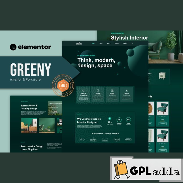 Greeny – Interior Elementor Template Kit. Greeny is a collection of 18+ pre-built templates with a fully responsive, modern, and customizable design suitable for furniture, creative, interior, and portfolio websites. The kit is optimized for use with Elementor page builder and works well with the free Hello Elementor theme.