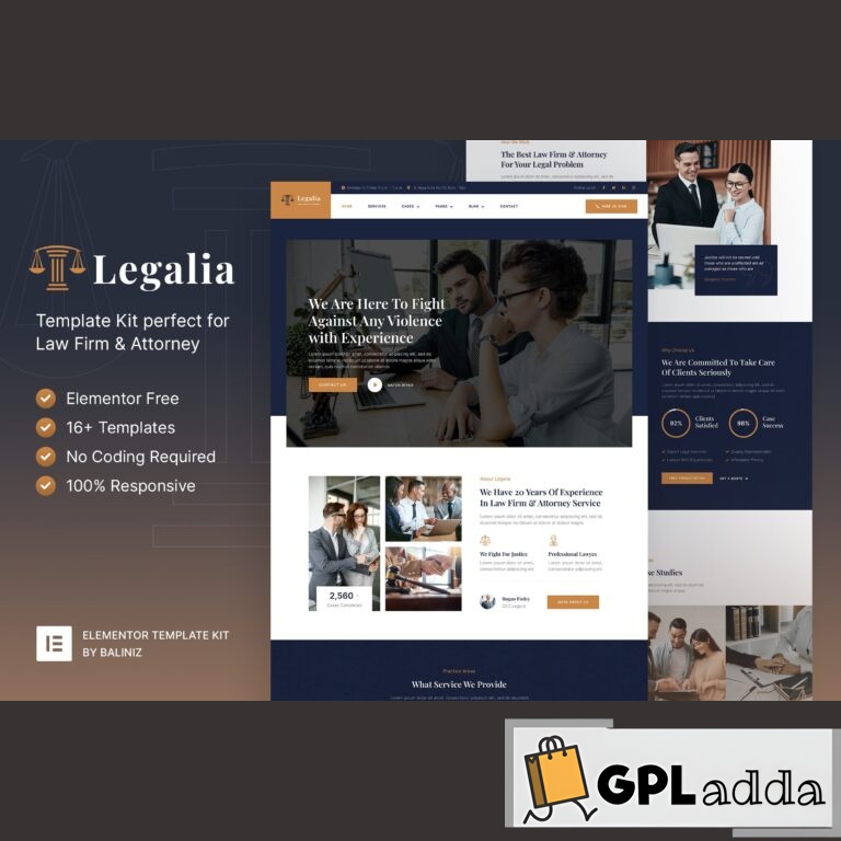 Legalia is a modern ready-to-use Elementor Template Kit specially designed for Law Firms, Lawyers, Legal Attorneys, Legal Advisor, Consultants, Legal Consulting, and any kind of legal practice. Attract clients with an elegant design, present services with eye-catching illustrations to get more attention.