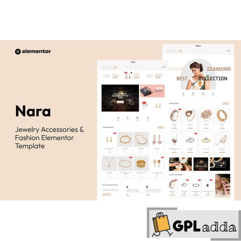 Nara is an Elementor Template Kit for quickly and easily creating a modern store website for retail jewelry store, fashion jewelry suppliers, handmade jewellery designers, fancy jewelry manufacturer, fancy product design & online gift shop using the Elementor Pro Page Builder and WooCommerce plugins for WordPress.