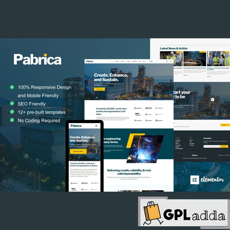 Pabrica elmentor template kit is designed for Engineering & Industrial Service. It offers 12+ pre-built templates with a professional and modern style. Easily create a company website for engineering & industrial service using this elementor template kit.