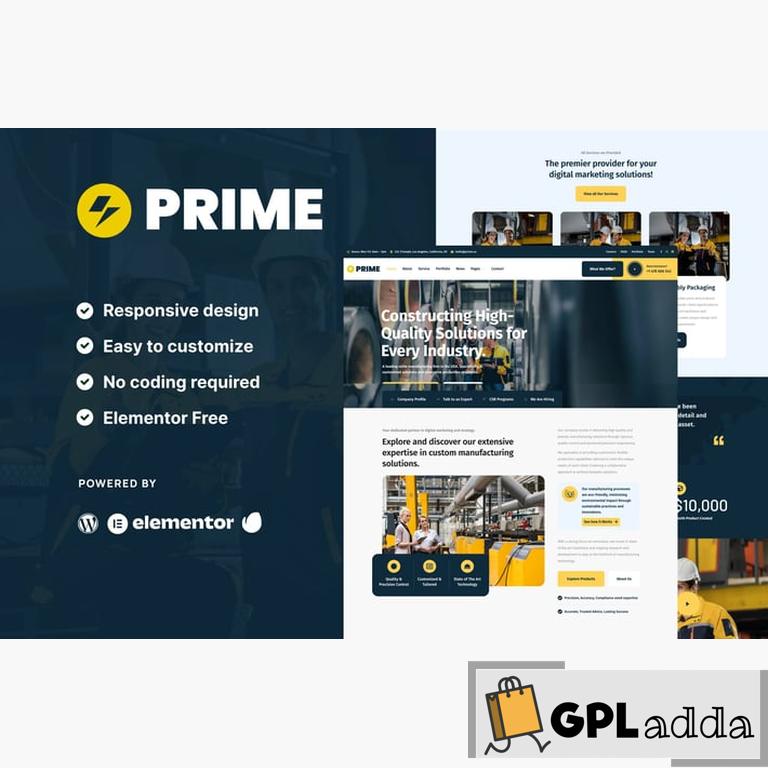 Prime is an Elementor Template Kit for industrial company websites. It has simple and clean design with modern layout style. Designed to use with Elementor Free version, ready to import and reusable for industrial company website, manufacture, fabrication, technical company, engineering, etc.