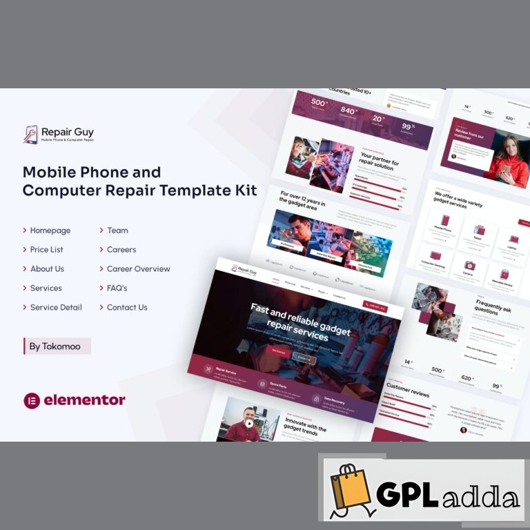 Repair Guy is Elementor Template Kit for mobile phone & computer repair website. This template has clean, modern, simple and professional look. You can easily build gadget repair website and its related service such as computer repair, gadget service, laptop service, computer maintenance, and even you can blogging while offering professional service. Just drag and drop, no coding required.