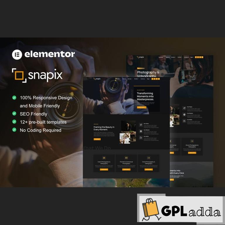 Snapix is an Elementor Template Kit for photography & videography services websites. It has 12+ pre-built templates with dark style, cool and creative design. You can also use this template kit for any kind of businesses or services related to photography such as art gallery, commercial photography, online portfolio, portrait photography, videography services, event photography, aerial drone photo, etc.