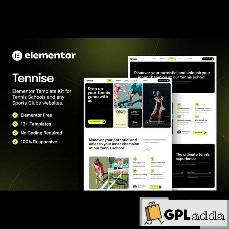 Introducing Tennise – the ultimate Elementor Template Kit for Tennis Schools and Sports Clubs! With its modern, sporty design and fully responsive layout, Tennise is the perfect choice for creating a website for tennis schools, clubs, academies, personal coaches, sports centers, and more.