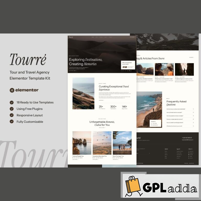 Tourre – Travel & Tour Agency Elementor Template Kit(NOT A WordPress Theme) is created especially for travel agencies, tour operators, and adventure booking services. Tourre has a simple, modern, and clean design with 100% responsive layout, and very easy to customize and can be used by anyone without having to understand coding.