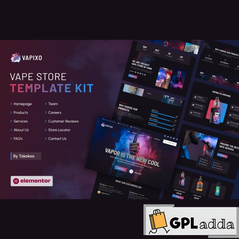 Vapixo is a modern and clean Elementor Template Kit that is perfect for a Vape Community & Cafe, Vape Store, Vapor, Liquid Store, Electric Cigarette, or any other related business. This template has a professional design with a 100% responsive layout, retina-ready, and very easy to customize because it uses Elementor, so you don’t need a single line of coding!
