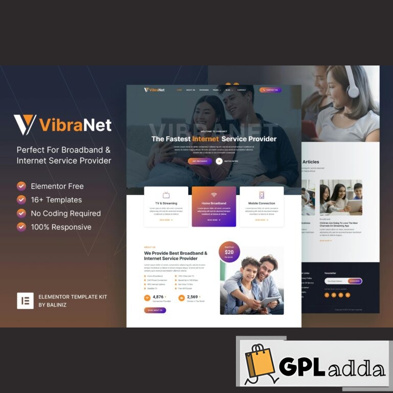 Vibranet is a modern Elementor Template Kit designed for Internet Service Providers, Broadband, Telecom, Cable TV Providers, and Technology companies. It offers a professional and functional website template that is responsive and retina-ready.