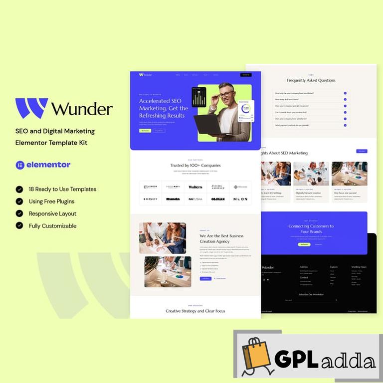 Wunder – SEO & Digital Marketing Elementor Template Kit (NOT a WordPress Theme) created especially for SEO websites, social media marketing, digital marketing, search engine optimization, seo agency, marketing agency, advertising company, media agency and marketing agency business, or any type of business who wants to publish the services in a professional way. Wunder has a simple, modern and clean design with 100% responsive layout, and very easy to customize and can be used by anyone without having to understand coding. This template kit includes stunning carefully crafted 14 Pages and 18 Stunning Templates, you can build your professional-looking website just a click away.